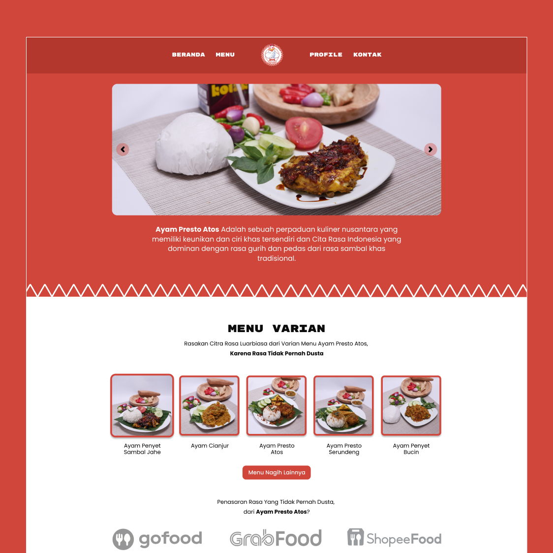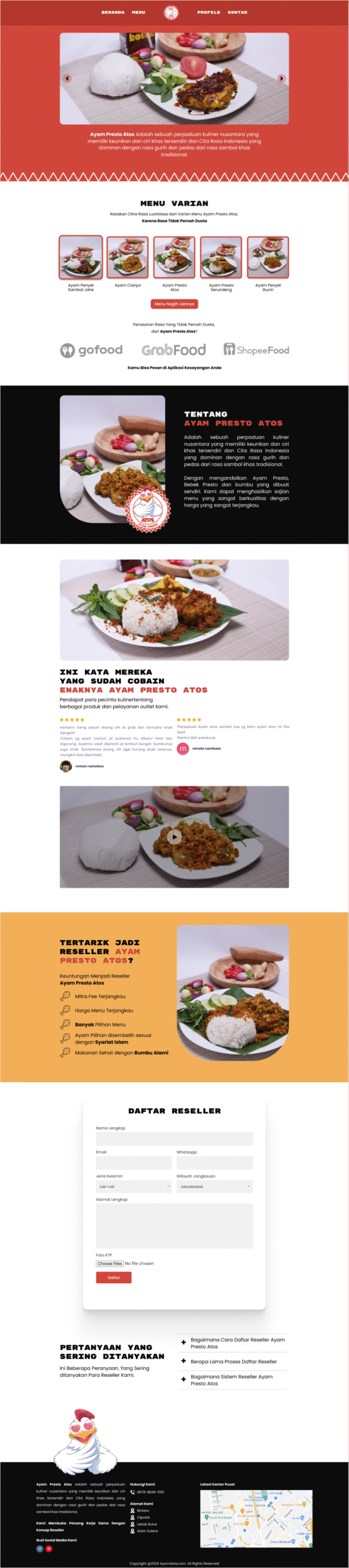 Website ini dikembangkan untuk Ayam Atos, sebuah brand kuliner yang menyajikan olahan ayam kekinian dan sedang berkembang melalui sistem kemitraan. Proyek ini bertujuan untuk membangun website company profile yang profesional, menampilkan identitas brand secara kuat, sekaligus mendukung program ekspansi kemitraan dan kemudahan pemesanan produk makanan melalui platform digital seperti GrabFood dan GoFood.