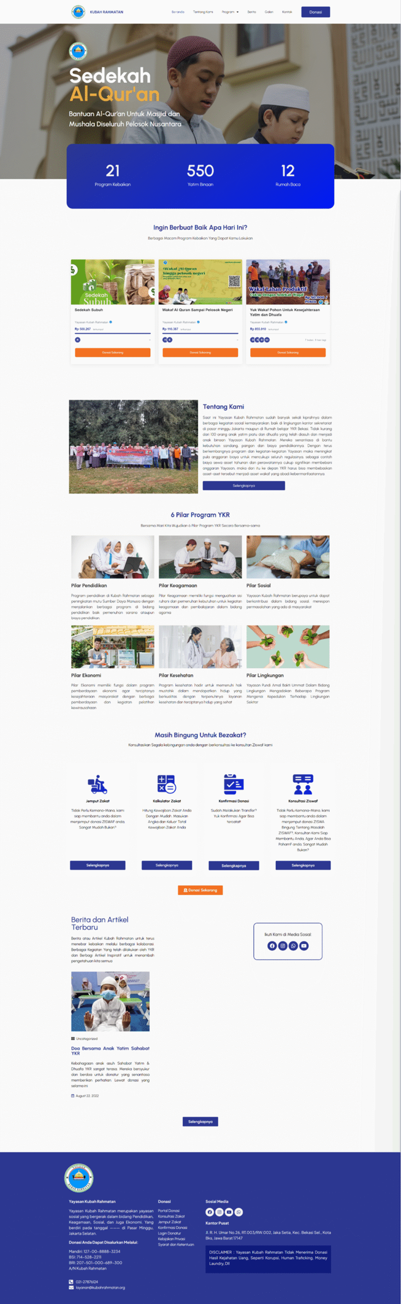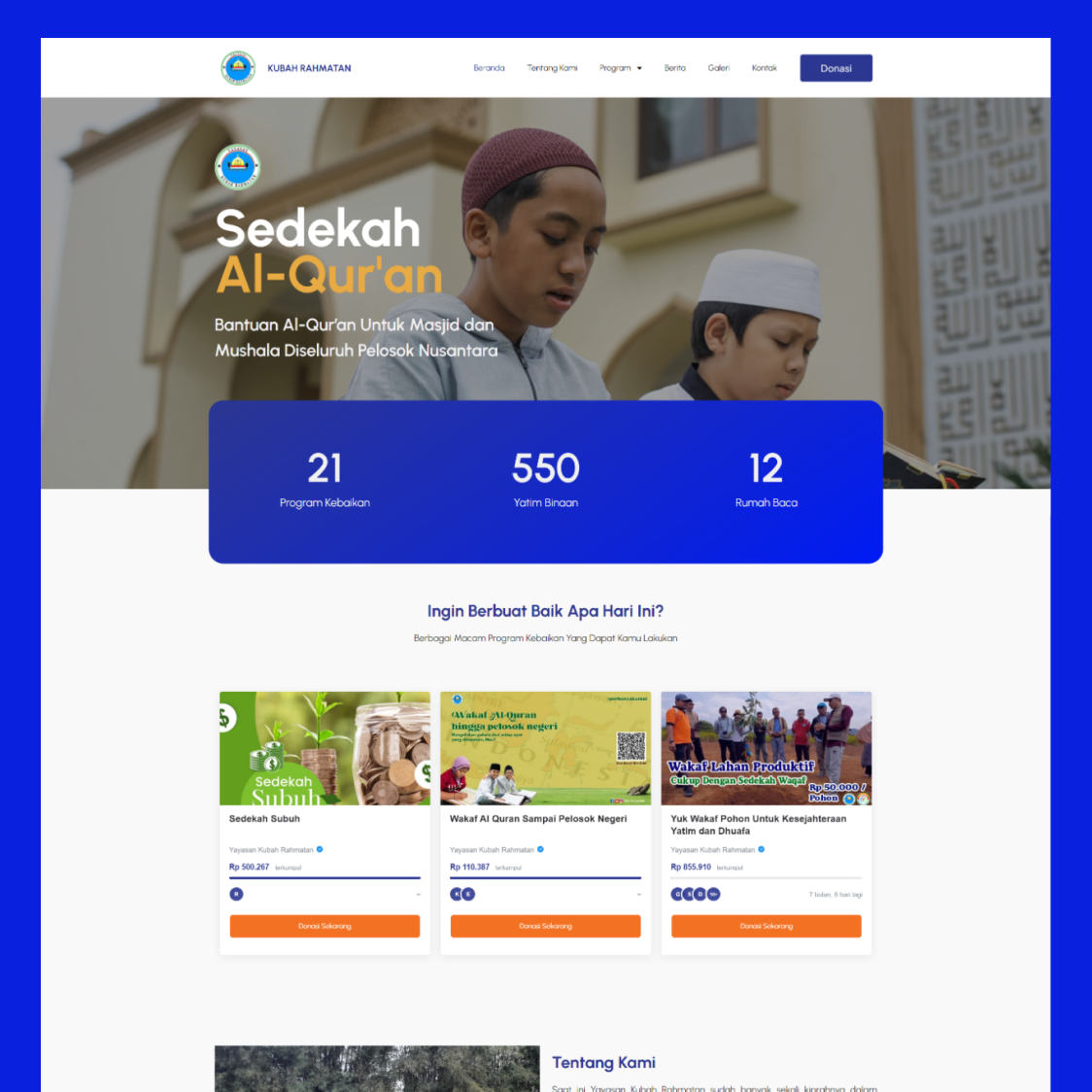 Website ini dikembangkan untuk Yayasan Kubah Rahmatan sebagai sarana resmi penyampaian informasi kelembagaan dan pengelolaan donasi digital. Proyek ini bertujuan menciptakan platform online yang tidak hanya menampilkan profil yayasan secara profesional, tetapi juga menyediakan sistem donasi yang lengkap dan mudah digunakan oleh donatur dari berbagai kalangan.