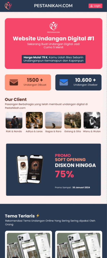 - Fitur Tambahan: Galeri foto, RSVP digital, hitung mundur acara, peta lokasi, akun tamu eksklusif, serta dukungan audio/video.